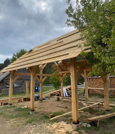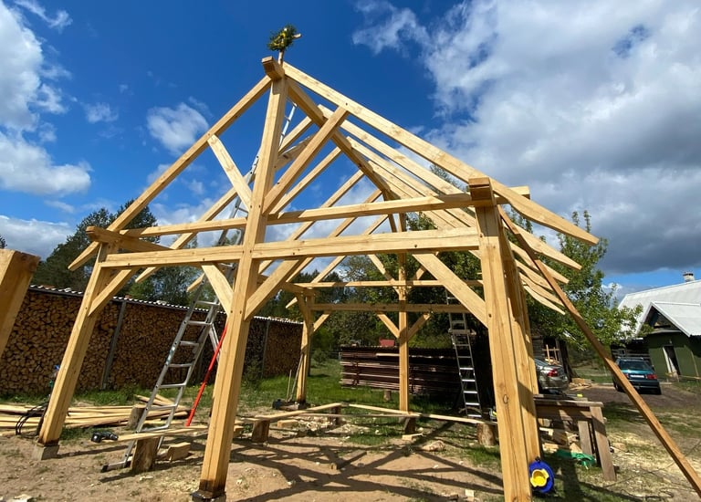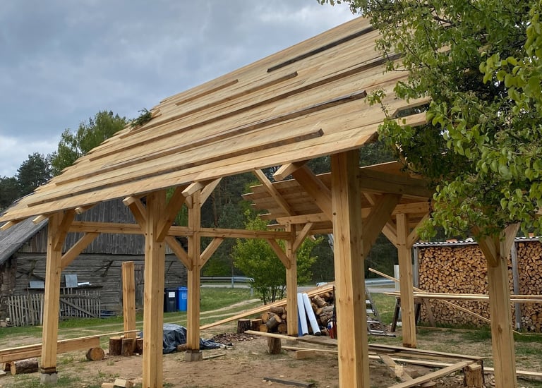 Stoginės, terasos, pavėsinės, ūkiniai pastatai, stogo konstrukcijos ir kt.